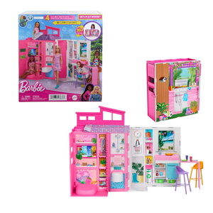 1x Barbie Getaway House dollhouse11x Accessories (dishware, chairs, towel, blanket, etc.)1x Kitchen with slide-out table1x Bathroom1x Lofted bedroom1x Cozy lounge