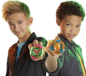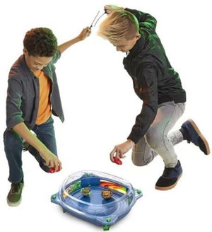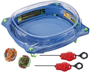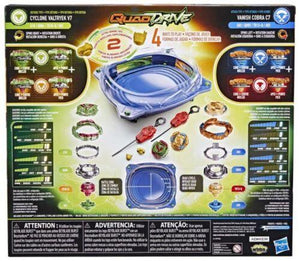 - Includes everything needed to battle: QuadDrive Galaxy Orbit Beystadium, 2 right/left-spin launchers, 2 spinning tops, and 2 extra Armour Tips.