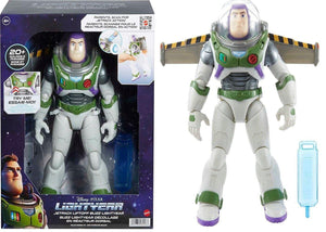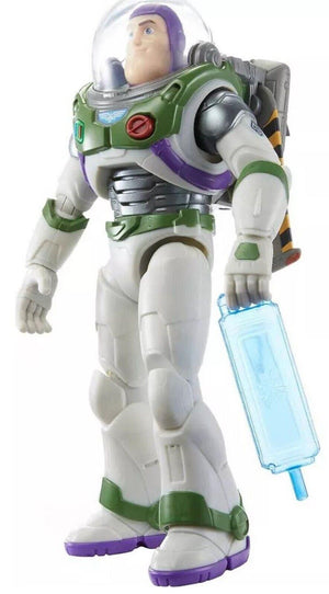 This Jetpack Liftoff figure presents Buzz Lightyear in his familiar Space Ranger Alpha suit with jetpack. After the fusion cannister is filled with water and loaded in, Buzz can snap on his helmet and spread his jetpack wings to their full 24.13cm width to prepare for liftoff. When Buzz is lifted off the ground, light and sound effects play and an actual vapor trail comes out of the jetpack for realistic flying hero play!