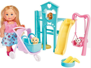 Evi Love: Puppy Playground is the perfect set for all pet lovers. There are three Evi dolls, eight puppies and many different accessories inside. Nestle your puppy away in their dog house, play with them on the swing, or just take them on a walk in their pram.