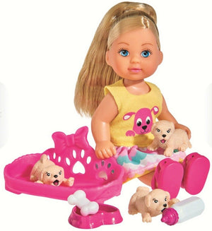 There are three Evi dolls, eight puppies and many different accessories inside.