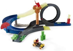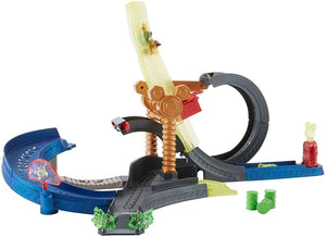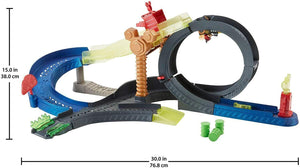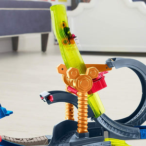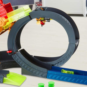 Super Charged Drop, Loop & Race Playset features two ways to race with two gravity-defying stunts. Race up the extreme vertical drop-down track or around the 360° loop-de-loop!