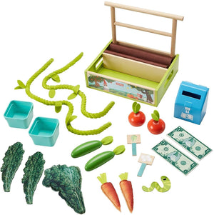 Planter box with fabric “dirt,” soft vines, wood trellis, play vegetables, and 2 baskets Wooden crate, 2-sided signs, cash box, and fabric money pieces