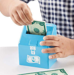 - Wooden crate, 2-sided signs, cash box, and fabric money pieces