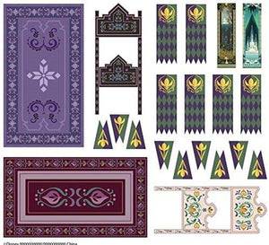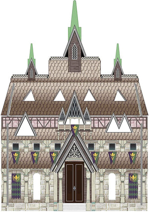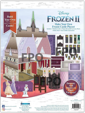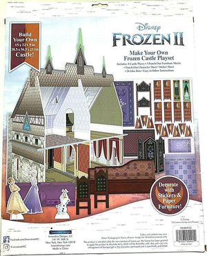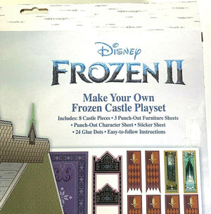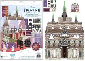 easy-to-build Frozen crafting kit includes 1 modular Arendelle castle in 8 pieces with easy slots and tabs, 3 punch out furniture sheets, punch out character sheet, sticker sheet, glue dots, and easy to follow instructions
