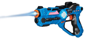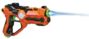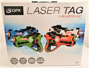 GPX: With GPX 4-Blaster Laser Tag set you can organize a game of laser tag with four friends and enjoy hours of fun. These blasters, in white, blue, green and orange, light up and vibrate with each tag and have an array of sounds for added excitement. Every game you play can feature up to four teams with an infinite number of players on each (must purchase additional sets for player counts beyond 4). Additionally, every blaster features nine lives per game, four tagging modes, a team selector button, volume control, reload button and an on/off switch. The built-in IR receiver/transmitter allows you and your teammates to battle from over 130 ft away. Let the battle begin!