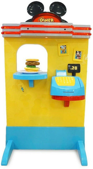 Mickey: Diner stand features a kitchen side with sink, grill and food bin, and a customer side with two counters. Grill makes frying sounds, service bell rings, cash register makes sounds, and diner sign lights up.