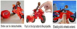 includes: 1 Elasticycle, 1 side car, 1 elastigirl figure and 2 projectiles