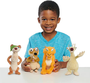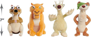 Set of 4 plushes includes: 1 Diego the saber-toothed tiger, 1 Scrat the saber-toothed squirrel, 1 Sid the sloth, and 1 Buck the weasel, all sized at 7 inches