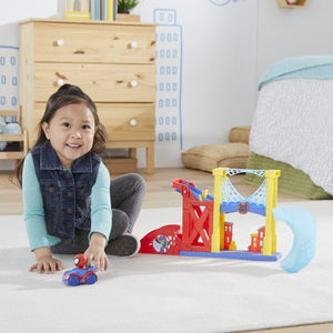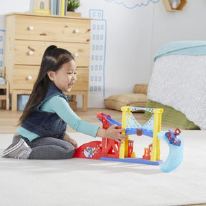 Celebrate Spidey and His Amazing Friends with a playset that has a need for speed! Zip vehicles across the bridge and down the slide for fast fun, or speed through the street below.