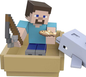 Minecraft: Bring this exciting Treasure Hunt adventure pack to life, allowing fans to recreate an in-game event where Steve goes fishing and meets a friendly Dolphin. The set includes 12 play pieces: three 3.25-in figures, including Steve, plus a boat, fishing rod, papercraft coral reef, and more!