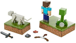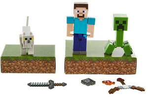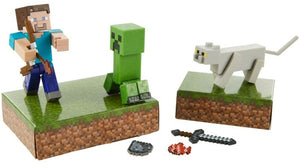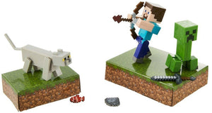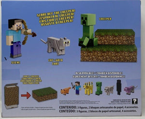 Complete adventure pack includes posable Steve, Cat and Creeper character figures in 3.25" scale, weapons, accessories and paper craft blocks to create extra terrain