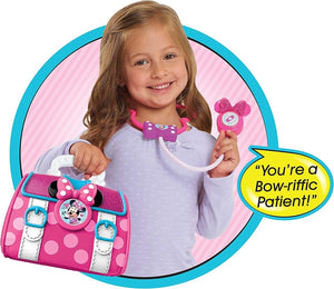 The Minnie Bow-Care Doctor Bag Set includes Minnie's Doctor Bag, one light-up play stethoscope, play thermometer, play syringe, play otoscope, pretend bandage cuff, and 2 sticker sheets.