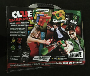 Clue: Enter the world of Clue Elimination, where you eliminate the competition before they can eliminate you! Each player takes a blaster and selects a House to play for: the House of Mustard, Scarlet, Peacock or Green. When the game starts, everybody runs for safety, and after 30 seconds, it’s time to start blasting each other! Every time you hit someone with your blaster, they have to give you one of their ID cards. Players who run out are eliminated, and the first player with a full set of ID cards is the winner! Start blasting and be the last one standing in Clue Elimination!
