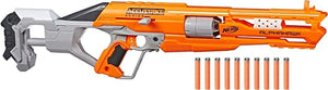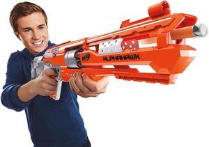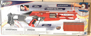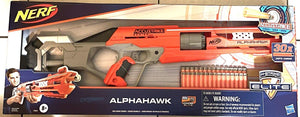Nerf: This version of the Nerf AlphaStrike Elite blaster comes with 30 Official Nerf AlphaStrike Elite darts -- triple the darts of the original blaster! The AlphaHawk blaster has a 2-sided bolt, making it great for right-handed and left-handed battlers to use. The drum is easy to load -- press a button and it swings out so you can easily access the dart chambers. Load 5 darts and swing the drum back into place. Pull the bolt back and release it, and press the trigger to fire 1 dart. The drum revolves when you fire, lining up the next dart for firing. The blaster has 2 tactical rails for customizing with Nerf accessories (not included) and a textured grip for a firm hold. No batteries required.
