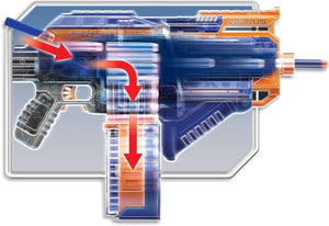 - Fully motorized blaster with a 30-dart drum utilizing Elite darts