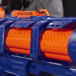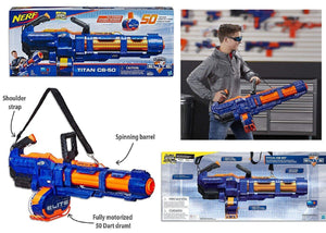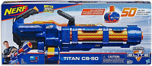Toy Includes: NERF Elite Titan CS 50 blaster, 50-dart drum, 50 Elite darts, strap and instructions