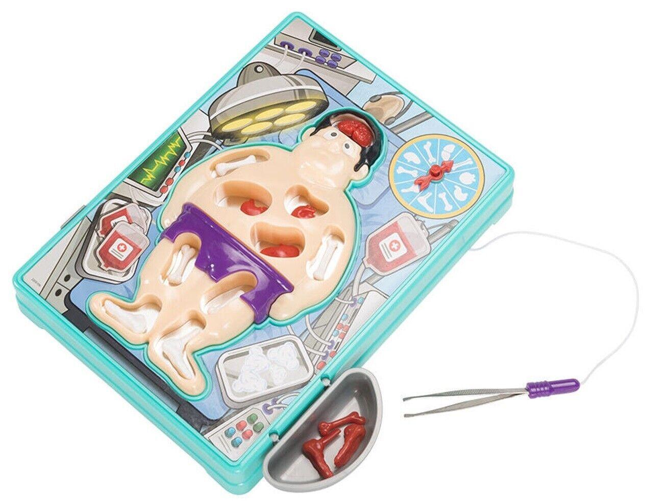 This game requires a steady hand and a cool state of mind under pressure; do you have what it takes? Players take turns spinning the wheel and then using the surgical tweezers to remove the body part shown. If you touch the sides or the operating table, everything shakes, and you lose! For budding little doctors and surgeons, this game is a great way to practise hand-eye coordination under pressure and is also a fun way to connect with friends, siblings, and family members.