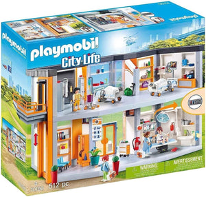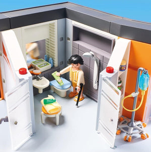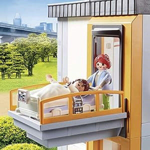 Set includes four figures, hospital building, medical devices, rolling patient beds, furnishings for the patient room, medical charts, medical cart, IV pole, and many other accessories