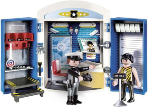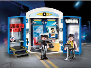 Play Box opens to reveal a furnished police station, a screen, weapons, and camera. Complete with 2 figures, the Play Box can store all pieces inside.