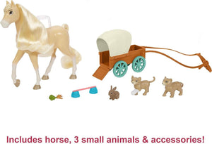 INCLUDES 3 ADORABLE ANIMAL FIGURES: a Chica Linda horse figure and a small wagon for transporting the lion cub and bunny figures. The set also comes with mini carrot treats and a beam accessory