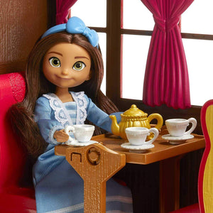 The Lucky's Train Home playset features Lucky doll (approx. 7-in/17.78-cm) wearing a beautiful full-length dress with matching purse, a ticket plus Lucky's horse, Spirit (approx.8-in/20.32-cm). The adorable train has four rolling wheels, a balcony, seating for four and a table that flips from tea time to game time. Accessories include a teapot and three cups that can be stored on a rack and there's a hook to hang Lucky's purse. Outside on the balcony, there are shoe holders (four) that allow two dolls to clip in while the train rolls! Kids will love playing with the Lucky's Train Home playset. Colors and decorations may vary.