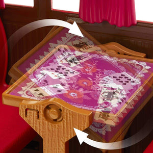 - Adorable train with four rolling wheels, a balcony, seating for four, and a table that flips from tea time to game time.