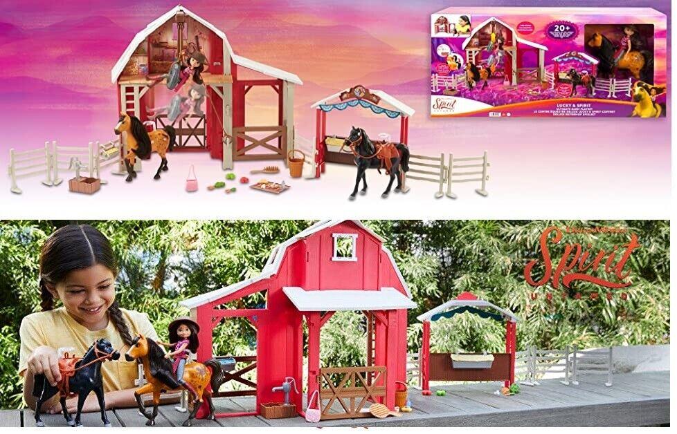 The Spirit Ultimate Barn playset is a complete play experience designed for kids to learn how to feed, groom, and take care of horses.