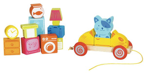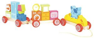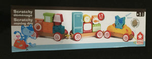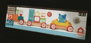 House of Toys: Scratchy the Cat's Moving Day Train Set is a brightly-colored, adorable 17 pc wooden block train set. Includes 3 magnetic connecting train cars and all of Scratchy's possessions, even his pet fish. Comes with a coloring book from Playfully Ever After included in the same packaging.