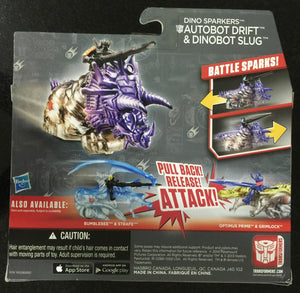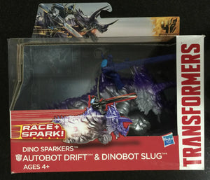 Key Features- Autobot Drift and Dinobot Slug Dino Sparker figures create amazing battle sparks